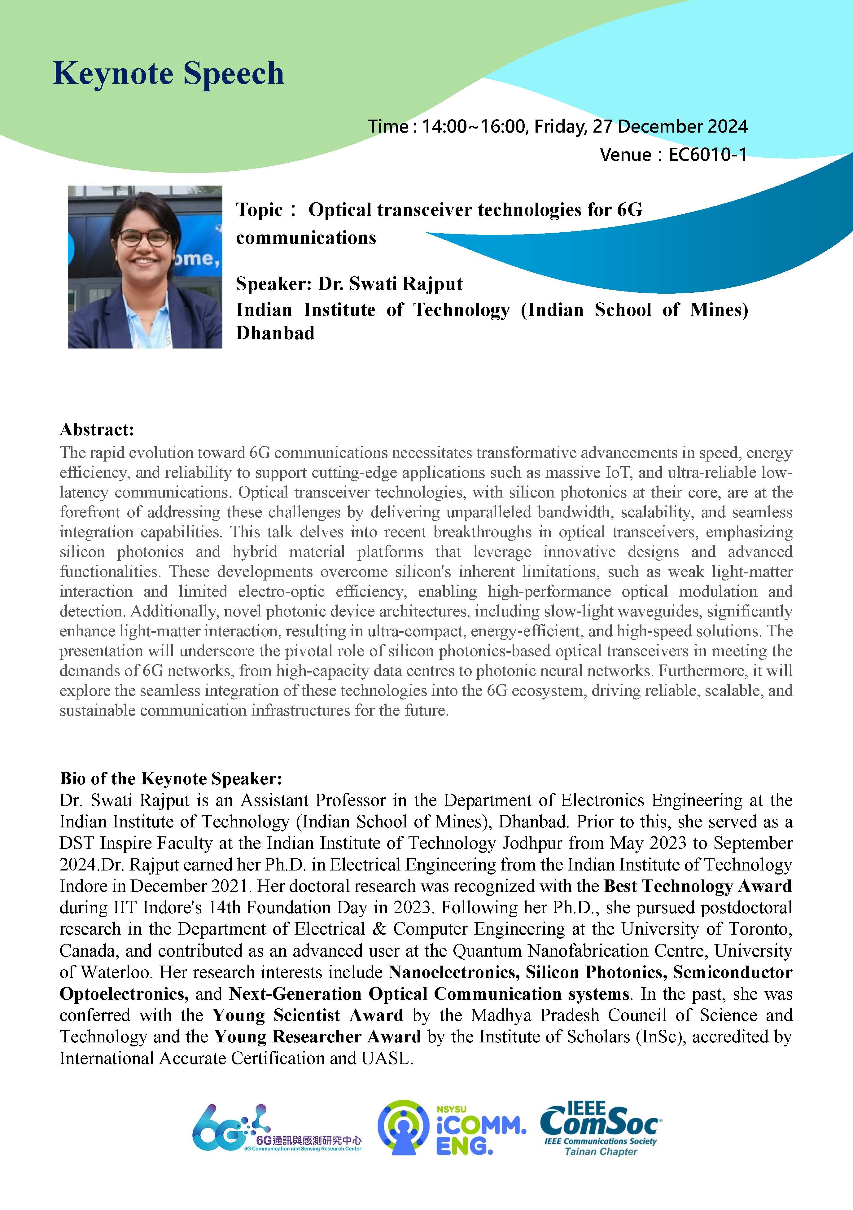 <LECTURE> Topic: Optical transceiver technologies for 6G communications, Speaker : Prof. Swati Rajput, Date : 27 Dec., 2024