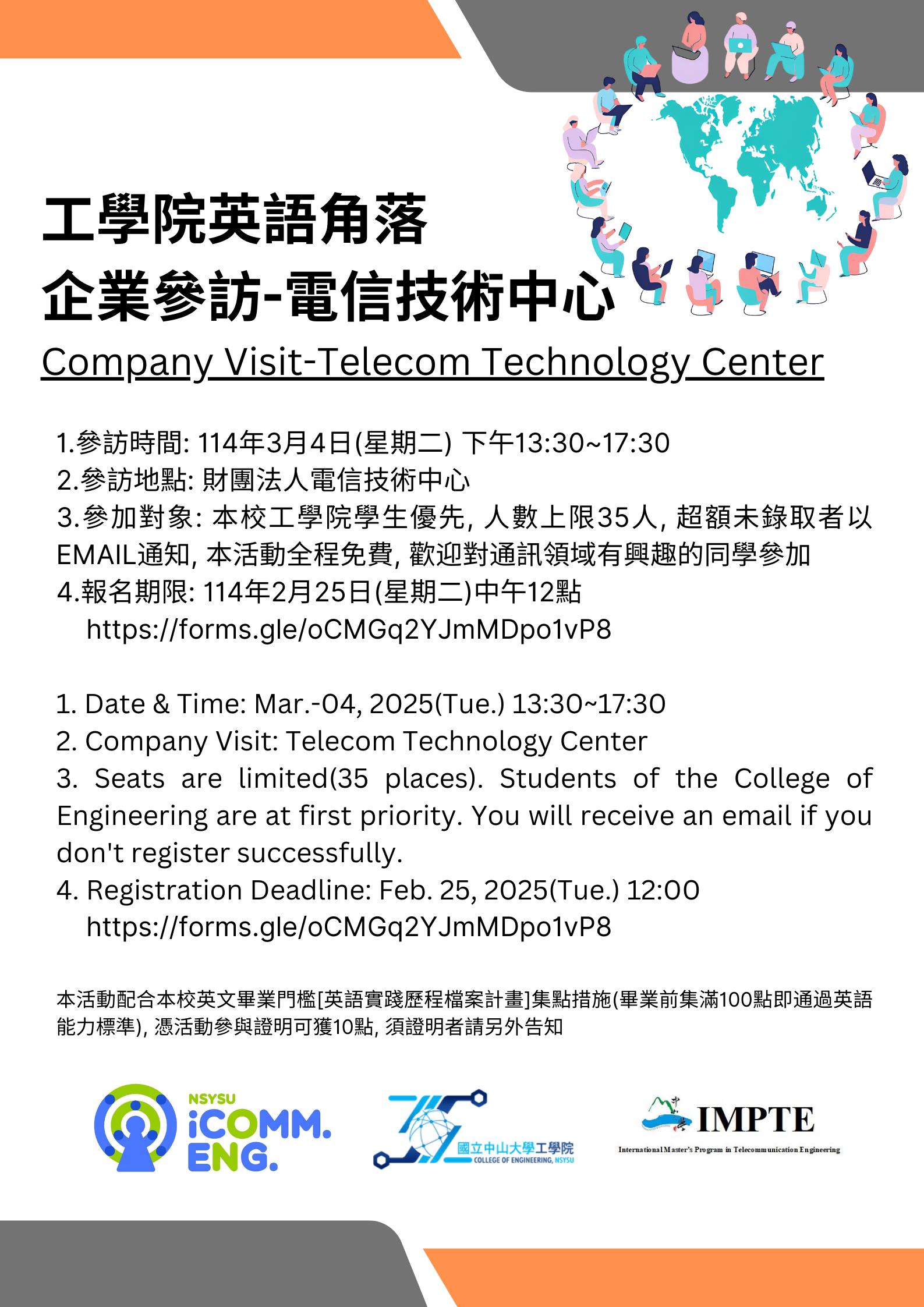 參加對象: 本校學生(工學院學生優先), 人數上限35人, 超額未錄取者以電子郵件通知, 本活動全程免費, 歡迎對通訊領域有興趣的同學參加