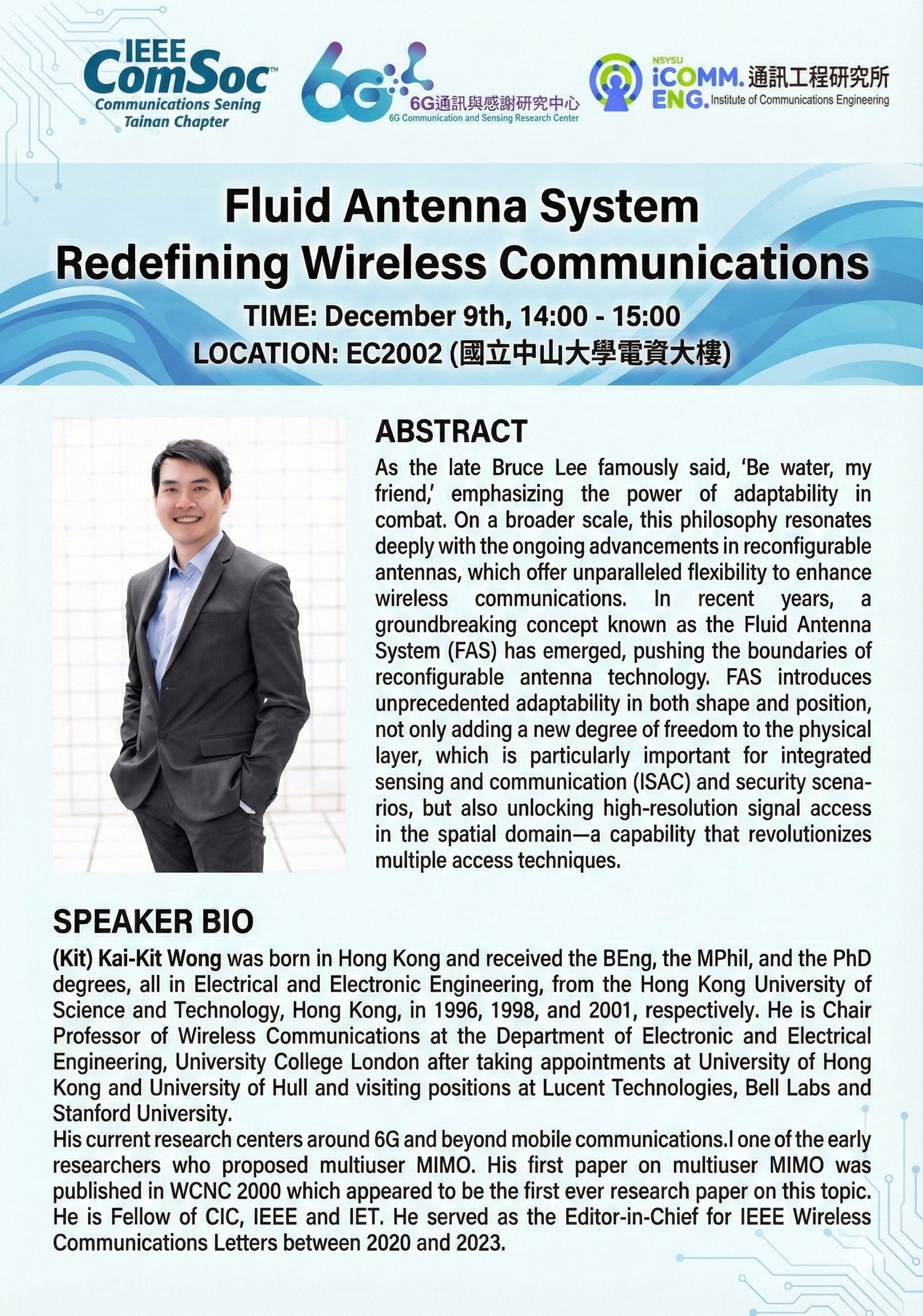 <Lecture> Topic: Fluid Antenna System Redefining Wireless Communications, Speaker: Professor Kai-Kit Wong, Date: Dec. 09, 2025